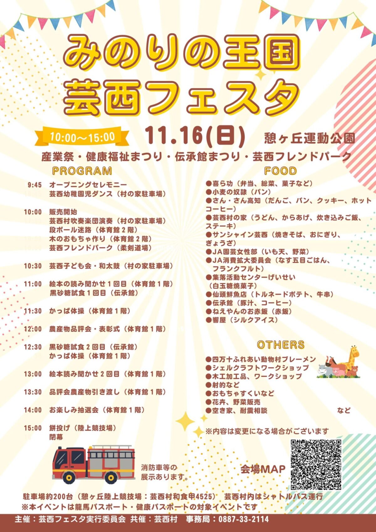 産業祭・健康福祉まつり・伝承館まつり・芸西フレンドパークを一堂に会して開催するイベント。