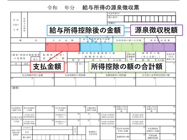 これで源泉徴収票に記載されている給与の額、控除の額、源泉徴収された額が転記されたことになります。
