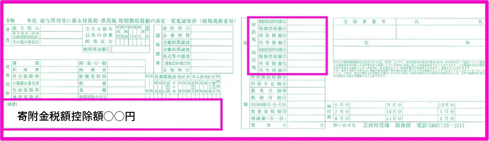 会社の給料から税が天引きされる場合、備考の下線部分に寄附控除が記載されます。